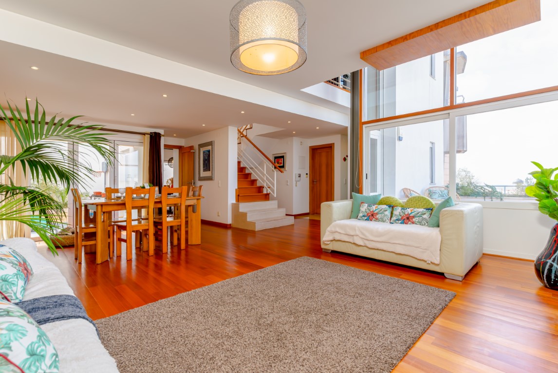 No Piso da entrada temos uma sala com lareira com envidraçados de piso duplo permitindo observar a magnifica vista panorâmica e de acesso fácil tanto ao terraço da frente quanto ao logradouro nas traseiras. Dispõe de uma cozinha espaçosa com ótima interligação a uma copa, a uma churrasqueira e a um maravilhoso espaço ao ar livre onde poderá fazer as suas refeições de verão.